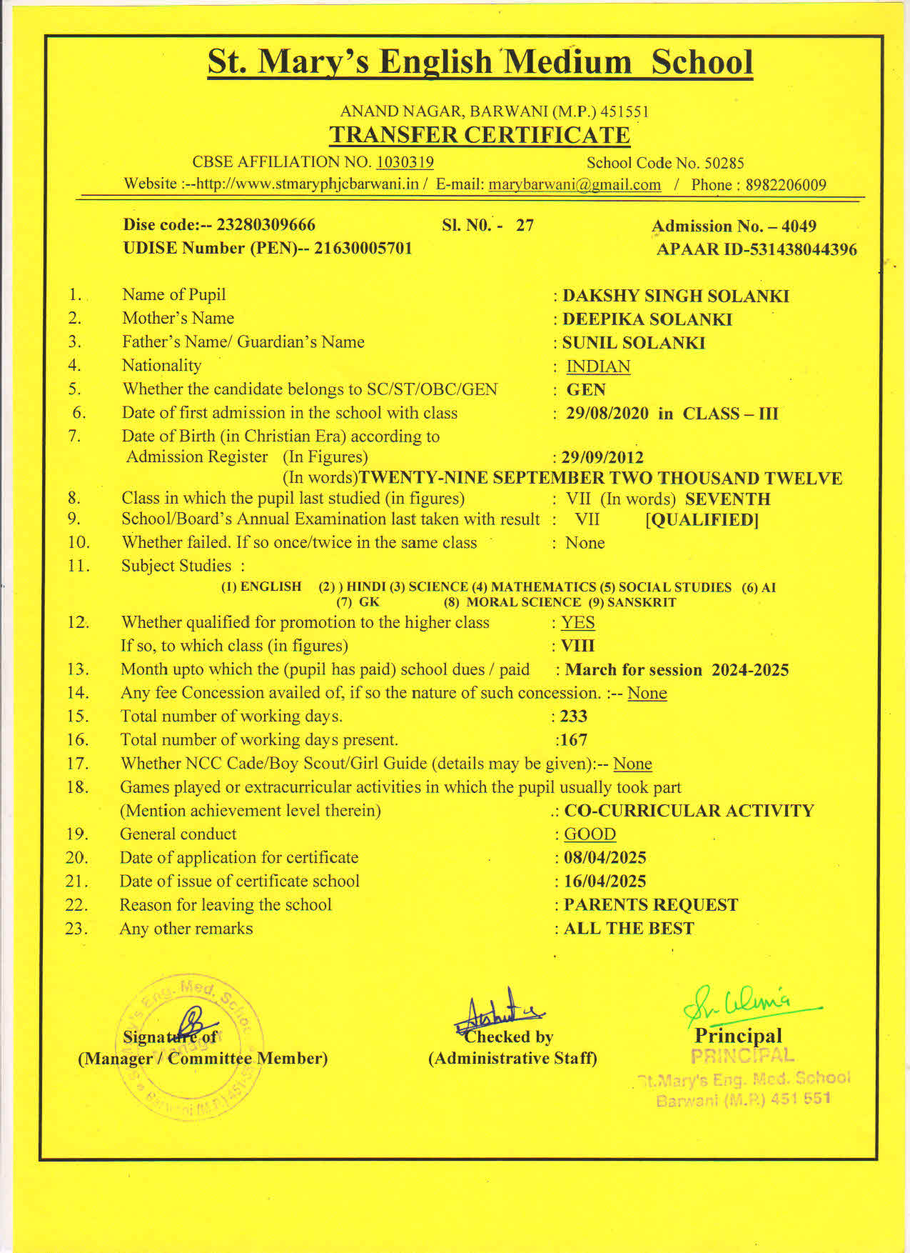 | 65 | DAKSH SINGH SOLANKI | VII | View | Download |